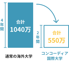 通常の海外大学の費用はおよそ1040万円。 それに対しコンコ―ディア国際大学の提供している新・コミュニティーカレッジ制度であれば、時間が短い分、学費は550万円〜に抑えられます。