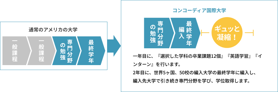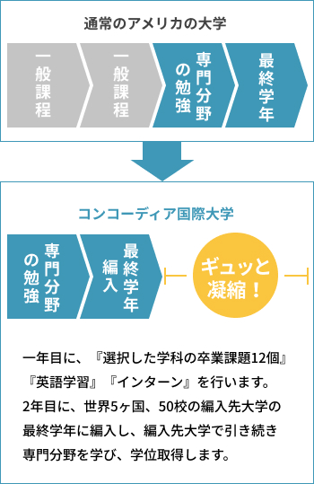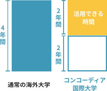 通常の海外大学は4年間で卒業しますが、 コンコーディア国際大学はその半分の2年間で卒業できるので、余った時間を有効に活用できます。