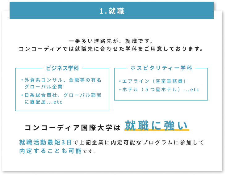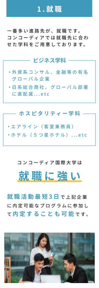※ご要望を伺ったうえで、より希望に沿った進路情報をお伝えするために、コンコーディア国際大学以外の進路のご提案をする場合もございます。